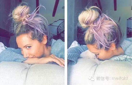 金发与粉紫色巧妙的融合在发髻上,既有小姑娘的俏皮又增添了女性魅力。